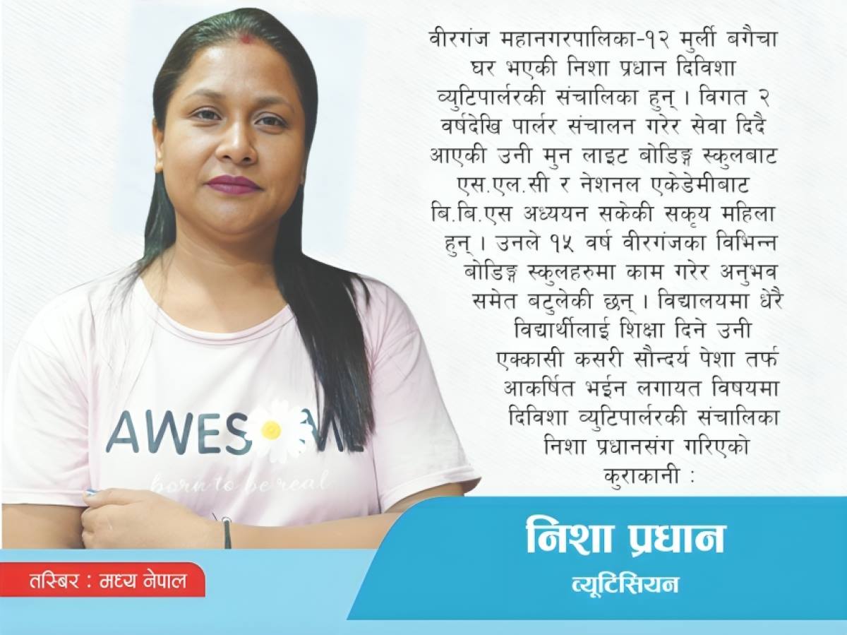 धेरैले पार्लर चलाउन संर्घष गर्नुपर्छ । तर मैले छोटो समयमा नै सफलता पाए । १५ वर्ष वीरगंजका विभिन्न बोडिङ्ग स्कूलहरुमा पढाएको हुनाले धेरै जनालाई चिन्ने मौका पाए । धेरै चिनेको साथी सर्कलले गर्दा पार्लरमा सफलता पाएको हो ।